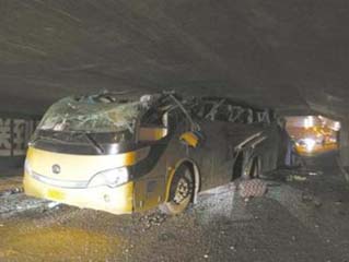 3米客车误入2米涵洞车顶被掀翻 38乘客受伤