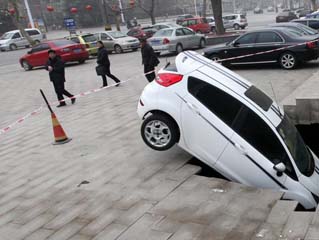 山东潍坊地面塌陷 一白色轿车被吞入大坑