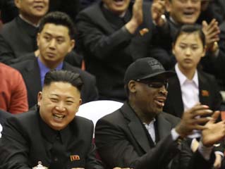 金正恩与罗德曼并肩看美朝篮球赛 兴致高昂