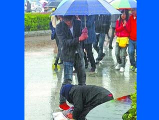 男生为街头乞讨老太撑伞 网友感动大加称赞(图)