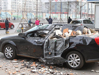 沈阳9级大风刮落高楼墙体 被砸轿车面目全非