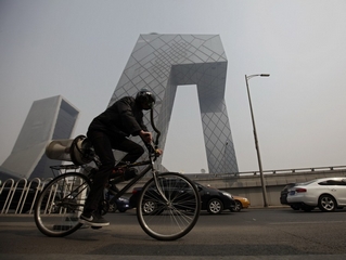 北京一外国男子自制“呼吸自行车”街头骑行