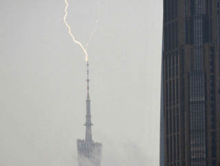 广州白昼如夜暴雨倾盆 广州塔遭雷击