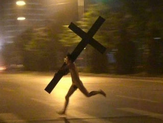 北京现男子扛十字架裸奔 曾夹充气娃娃狂奔