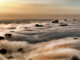 芝加哥隐身晨雾 高楼大厦若隐若现似仙境