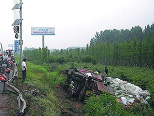 大货司机打瞌睡将车开进沟 车上大豆散落