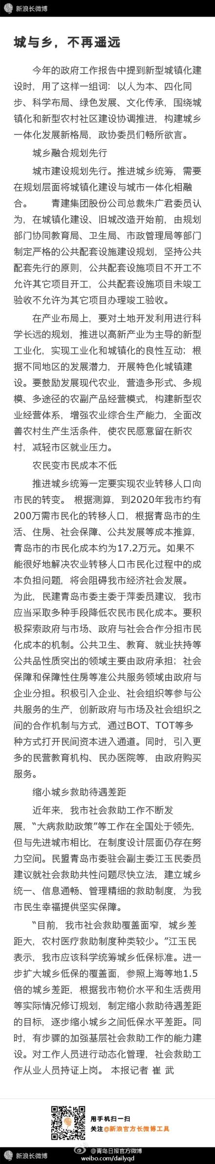 @青岛日报:【城与乡,不再遥远政协委员们畅所欲言】今年的政府工作报告中提到新型城镇化建设时,用了这样一组词:以人为本、四化同步、科学布局、绿色发展、文化传承,围绕城镇化和新型农村社区建设协调推进,构建城乡一体化发展新格局。