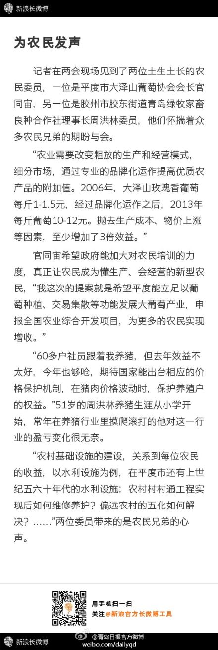 @青岛日报:【记者手记 为农民发声】记者在两会现场见到了两位土生土长的农民委员,一位是平度市大泽山葡萄协会会长官同宙,另一位是胶州市胶东街道青岛绿牧家畜良种合作社理事长周洪林委员,他们怀揣着众多农民兄弟的期盼与会。