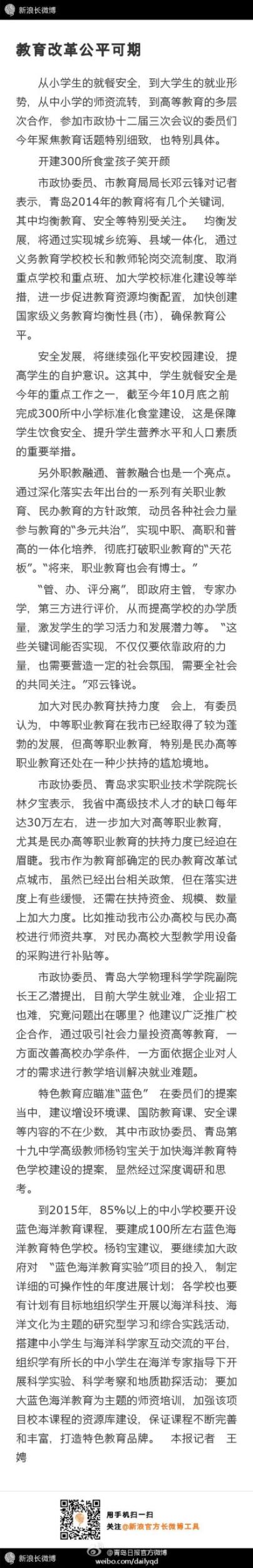 @青岛日报:【委员聚焦 教育改革公平可期】《教育改革公平可期》从小学生的就餐安全,到大学生的就业形势,从中小学的师资流转,到高等教育的多层次合作,参加市政协十二届三次会议的委员们今年聚焦教育话题特别细致,也特别具体。