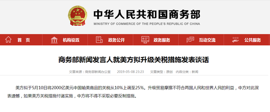 美方拟于5月10日将2000亿美元中国输美商品的关税从10%上调至25%。升级贸易摩擦不符合两国人民和世界人民的利益,中方对此深表遗憾,如果美方关税措施付诸实施,中方将不得不采取必要反制措施。