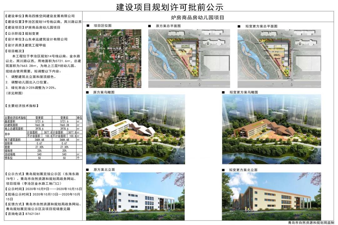 据了解,炉房商品房幼儿园即金水路幼儿园,为李沧区重点项目。幼儿园拟建为地上三层的9班幼儿园,共容纳约270名学龄前儿童。项目建设内容包括配套建设绿化、活动场地、道路、管线等室外工程,配置地下停车位50个。此次规划调整了建筑北立面和屋顶颜色,并调整了幼儿园出入口位置,幼儿园绿化率由≥25%调整为≥20%。