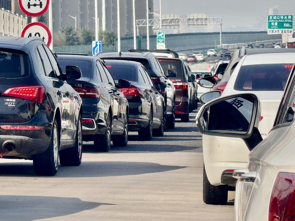据现场观察,从清晨开始,环湾路作为连接市区与外围高速的重要通道,机动车流量逐步攀升,至上午9时许达到高峰,路面车流密集但行驶平稳。各大高速收费站出市通道前,车辆自觉依次排队,在交通指引标识及工作人员疏导下,有序缓慢通行,未出现长时间拥堵或车辆加塞情况。