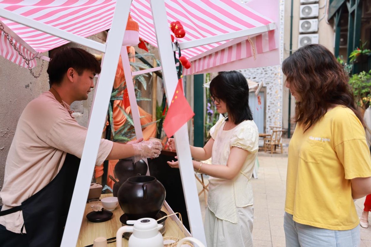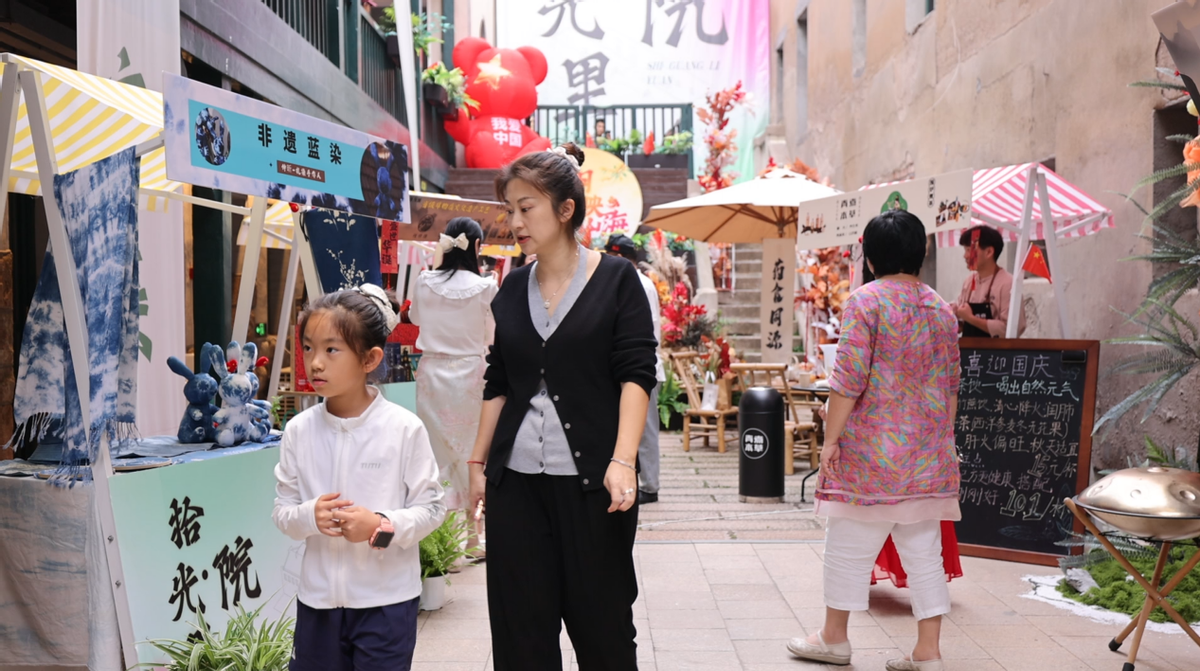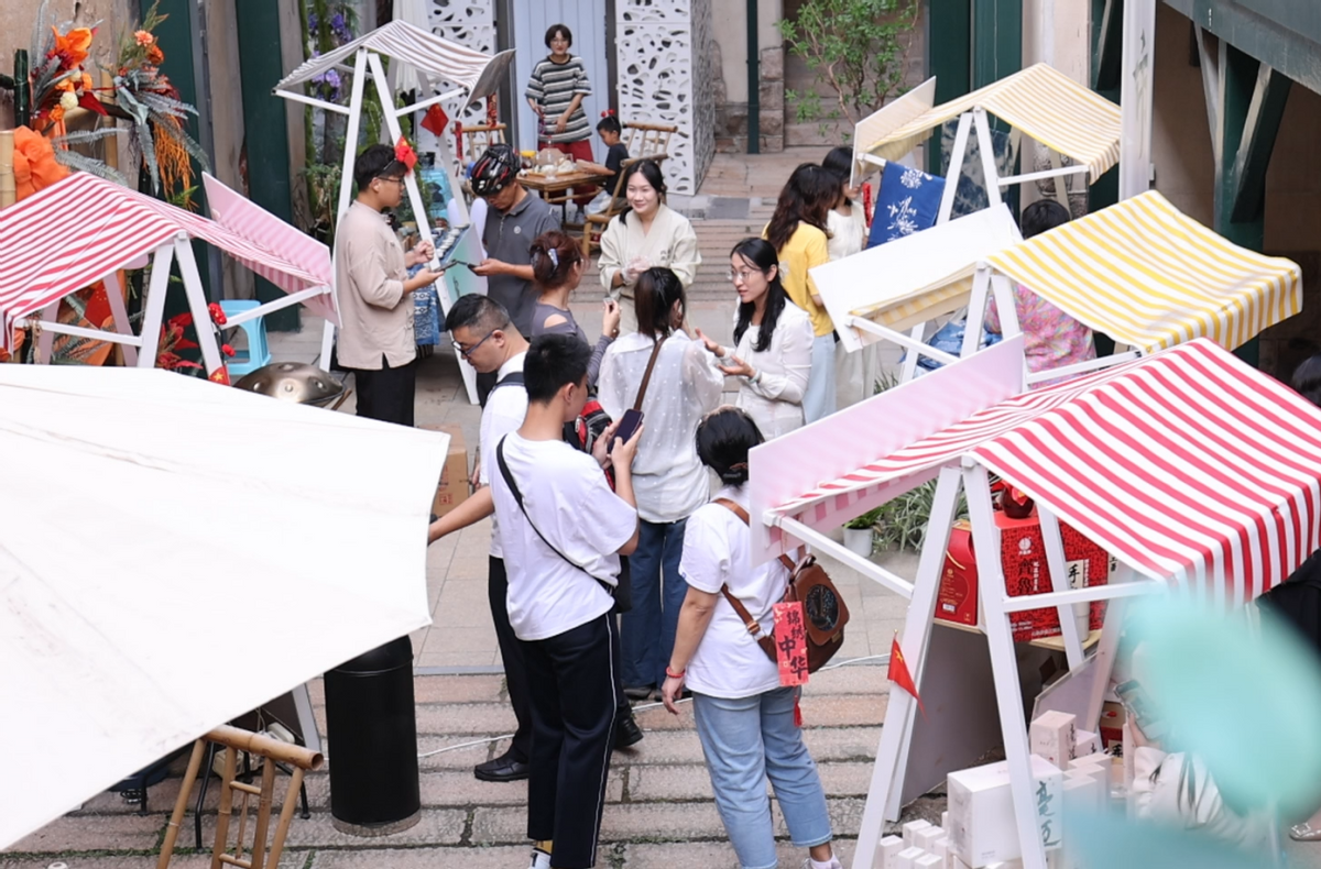 为增强游客参与感,还设置了多处美陈打卡点,结合展览内容与节日氛围,吸引年轻群体拍照分享。中心入驻商家手造联盟、小岛文创、市残联文创、设计宇宙咖啡、春雨文创、嗨海边DIY等也纷纷围绕双节主题进行氛围营造,并延长营业时间,共同激活“手造体验消费”。