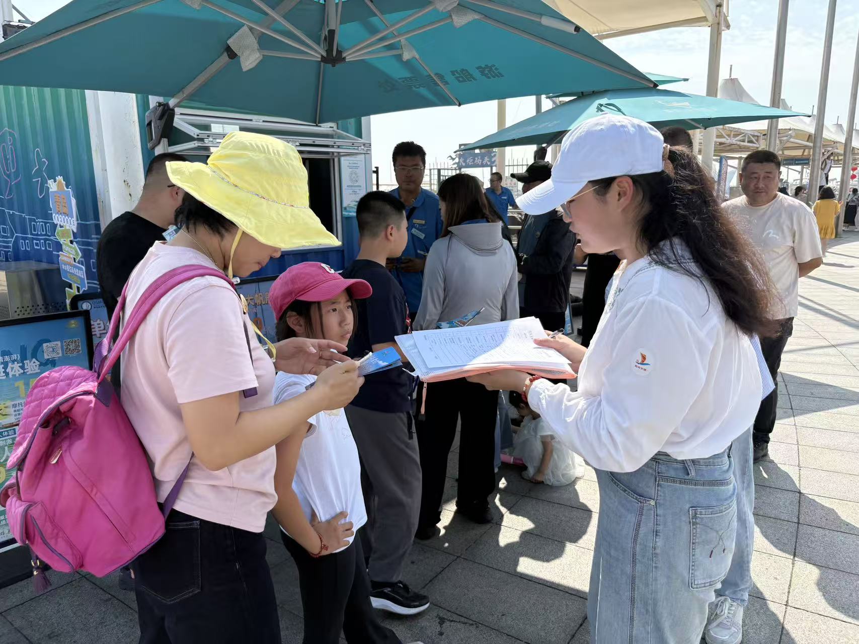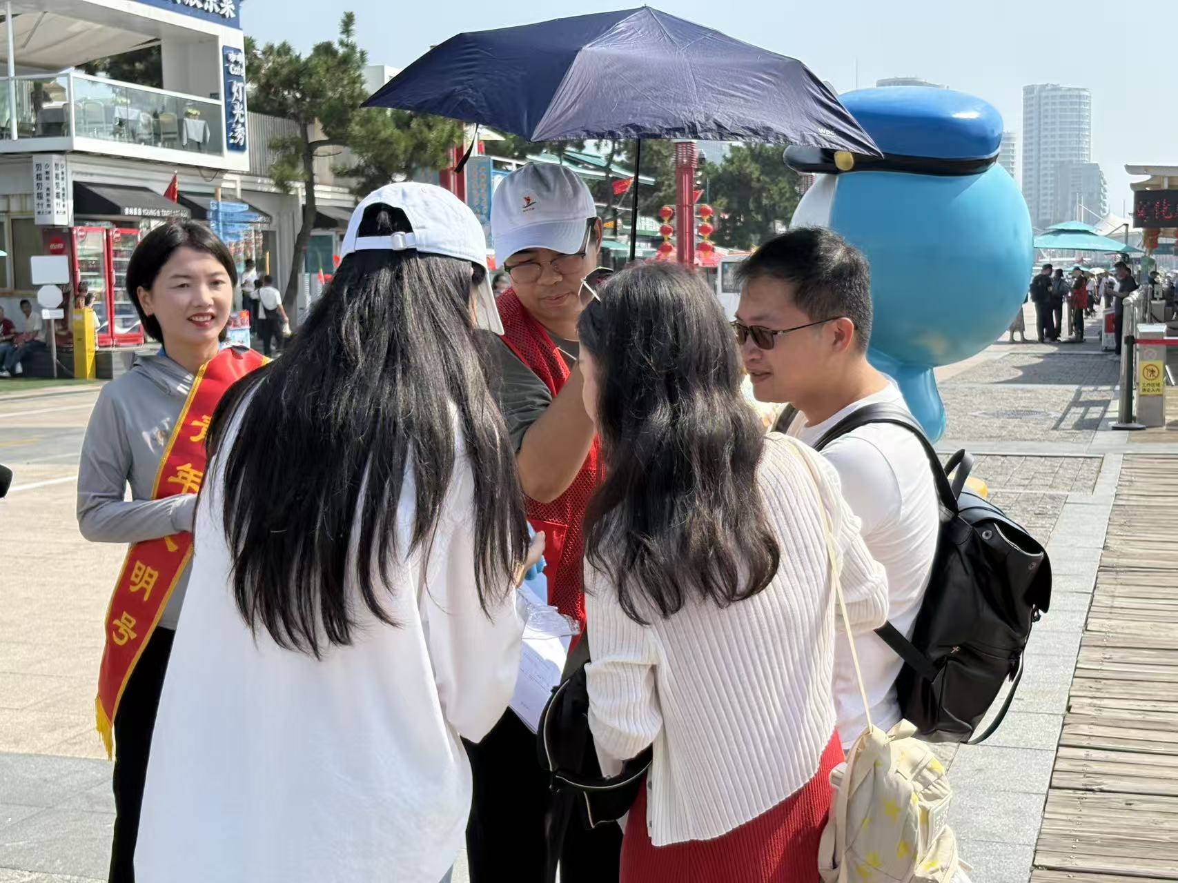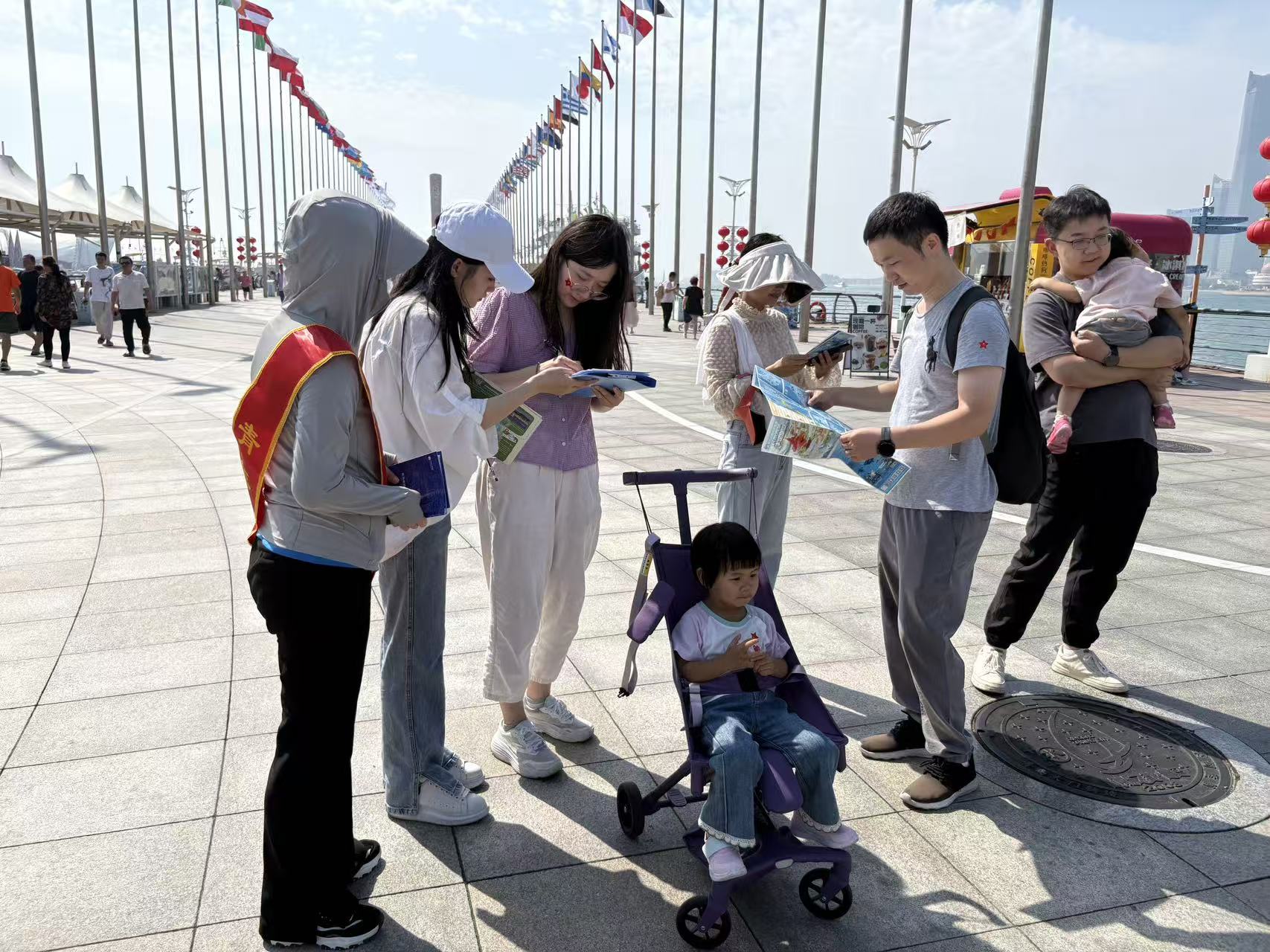 做好文旅“宣传员”,在一线服务中展现昂扬精神风貌、务实工作作风和亲切服务态度,现场发放青岛文旅宣传手册、导览图、研学集章打卡地图、文旅吉祥物等,把最美的青岛推荐给广大游客。