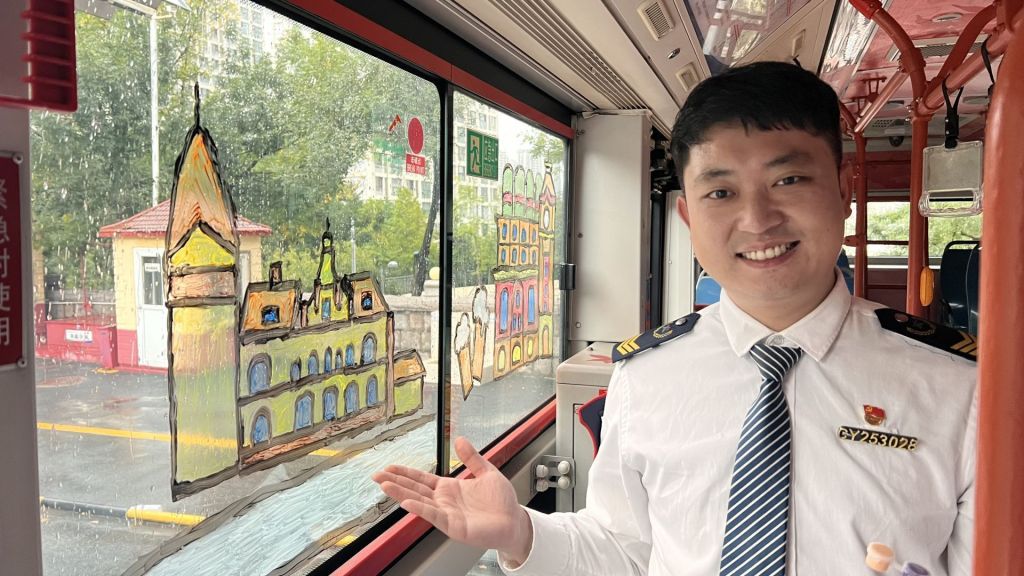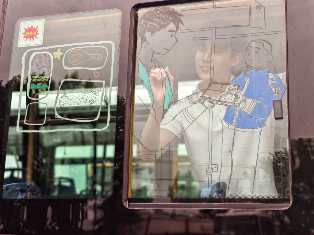 363路婚车巴士的“四季情书”,用四幅图画串联起人生的幸福瞬间,成为城市里流动的浪漫符号。而375路“深夜食堂”专车的车窗上,驾驶员递送餐盒的画面,正源自乘客王先生对深夜暖心服务的感恩之情。王先生表示,“我毕业后在海尔工业园上班,每天乘坐375路公交车,经常加班到很晚,踏上375路车的时候就像回到了家,师傅递过来热乎乎的盒饭直接暖到心坎里,希望通过此次手绘,让这份善意被更多人看见。”