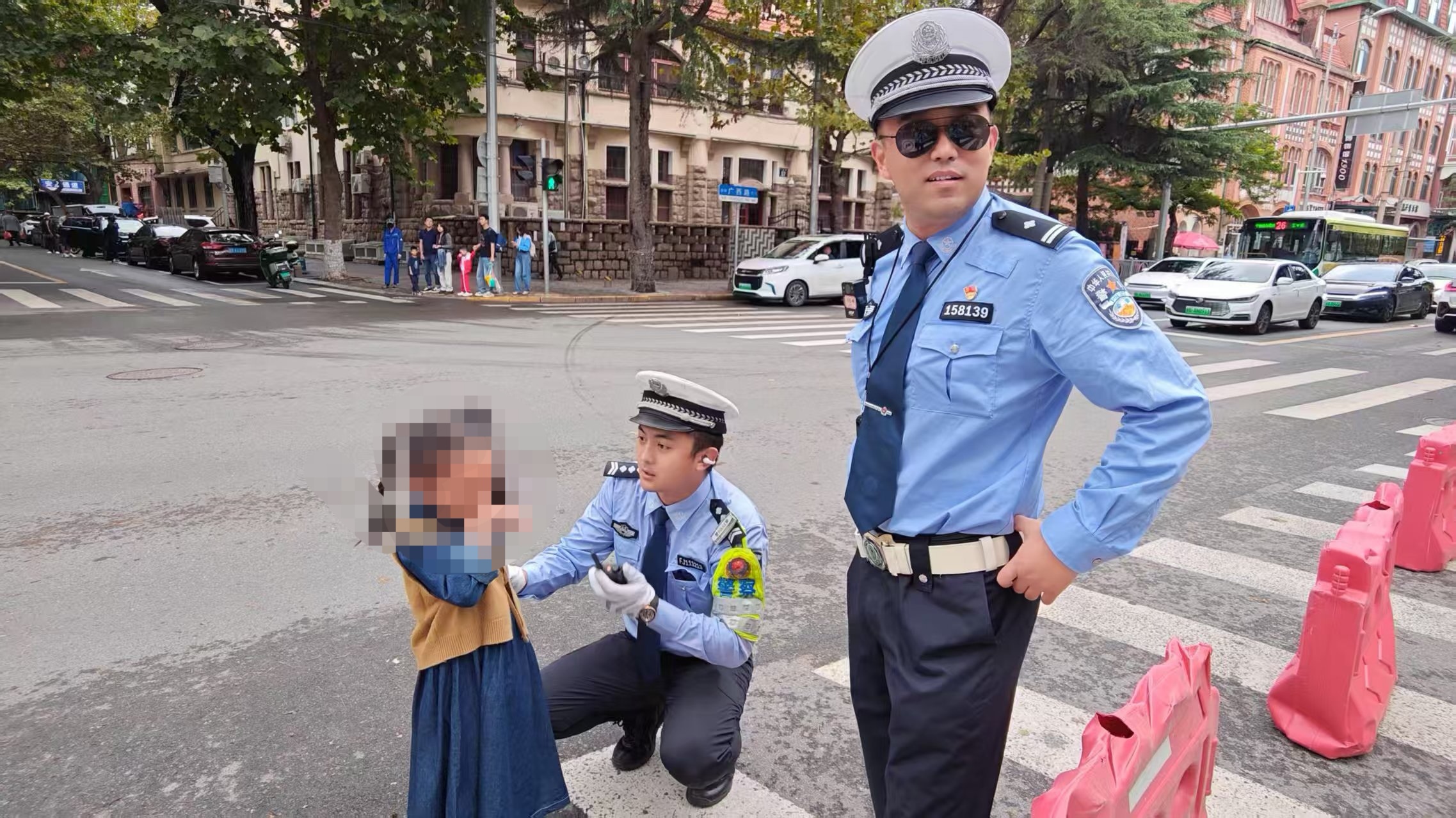 正在此执勤的交管市南区大队巡逻中队副中队长张际晖与辅警张鑫,接到一名热心群众的求助。只见该群众身边,牵着一名约五六岁、满脸泪痕的小女孩,焦急地表示孩子和家人走失,找不到家长了