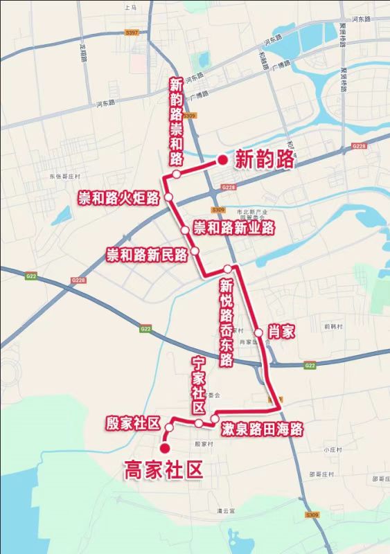 依据《公共汽电车线网设置和调整规则》确立的技术标准,为解决宁家社区、殷家社区、高家社区居民出行需求,同时填补崇和路(火炬路至新悦路)、田海路(岙东南路至漱泉路)、漱泉路(田海路至迎鸥路)、迎鸥路公交线网盲区,拟开通“新韵路—高家社区”支线线路。方案具体如下: