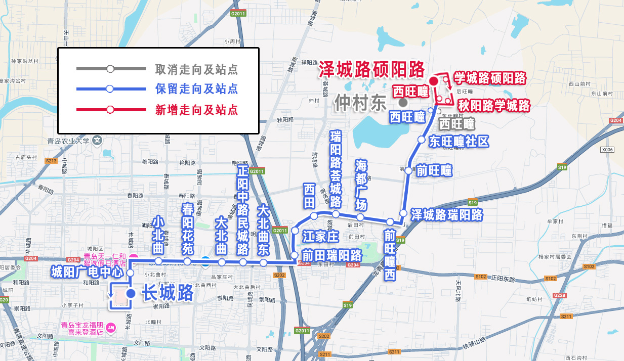 该线路主站:长城路,副站由仲村东调整为泽城路硕阳路,调整后为:长城路—泽城路硕阳路。