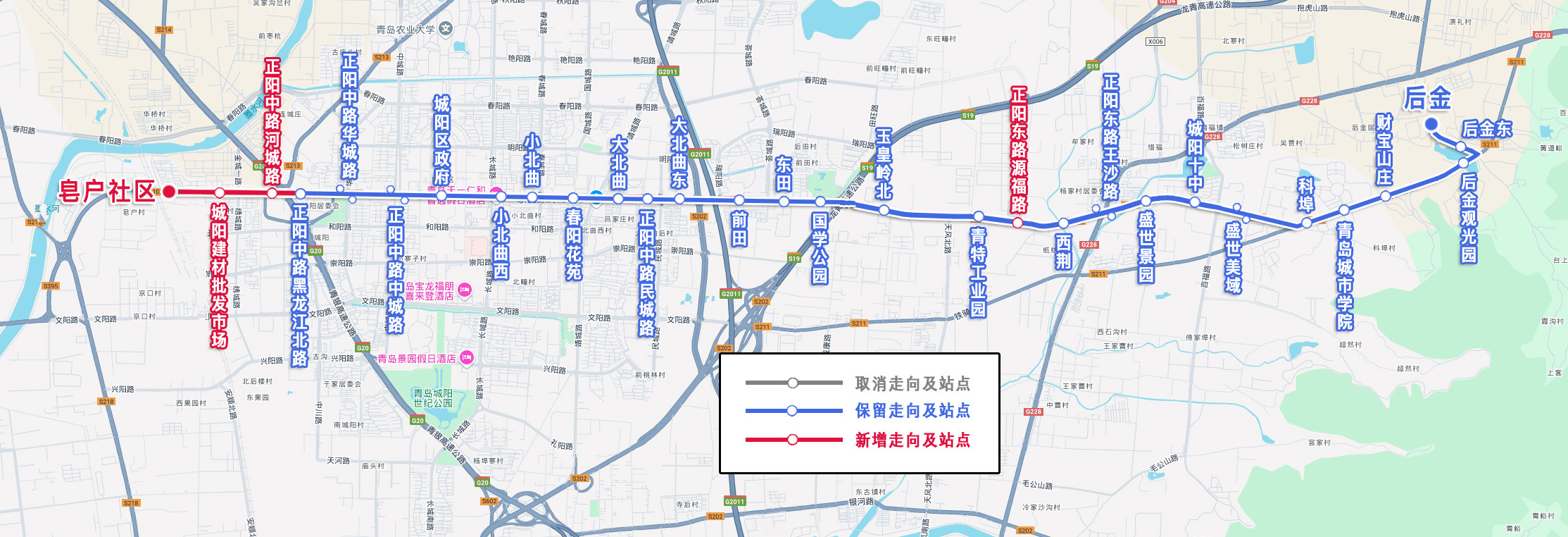 双向增设站:正阳东路源福路(新设)、正阳中路河城路(并120路)、城阳建材批发市场(并120路)、彩虹桥(新设)、皂户社区(新设)。