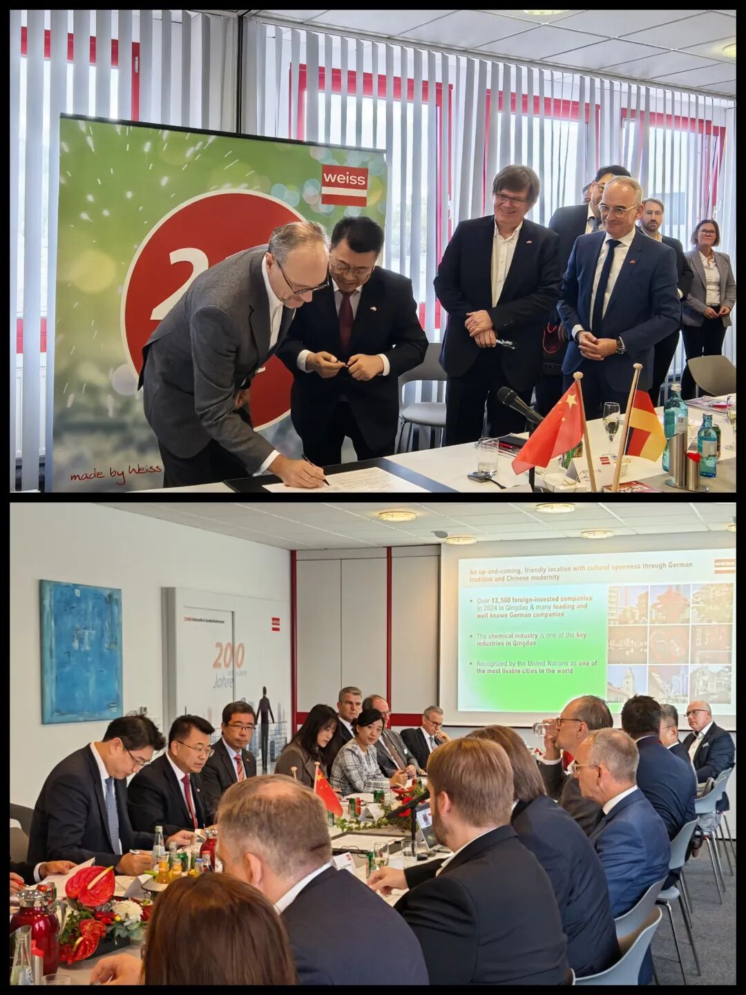 10月22日,韦思化工公司(Weiss Chemie)与青岛中德生态园管委会签署设立生产基地的投资意向书。韦思公司董事会主席韦思、首席执行官德勒,青岛中德生态园管委主任高善武,总领馆经商处参赞陈岩,当地政府官员及工商界代表出席签约仪式。