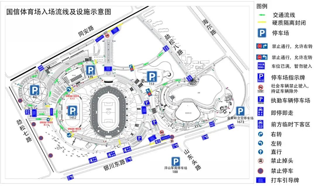 国信体育中心各大门外禁止所有车辆停放,尤其是同安路(劲松七路至劲松八路段)、银川东路(劲松七路至山东头路)、劲松七路(银川东路至同安路段),确保散场时通道畅通。
