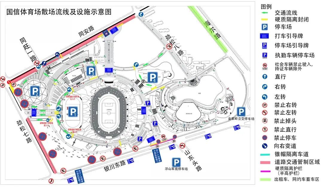 体育中心各大门外禁止停车,重点管控同安路、银川东路、劲松七路相关路段。