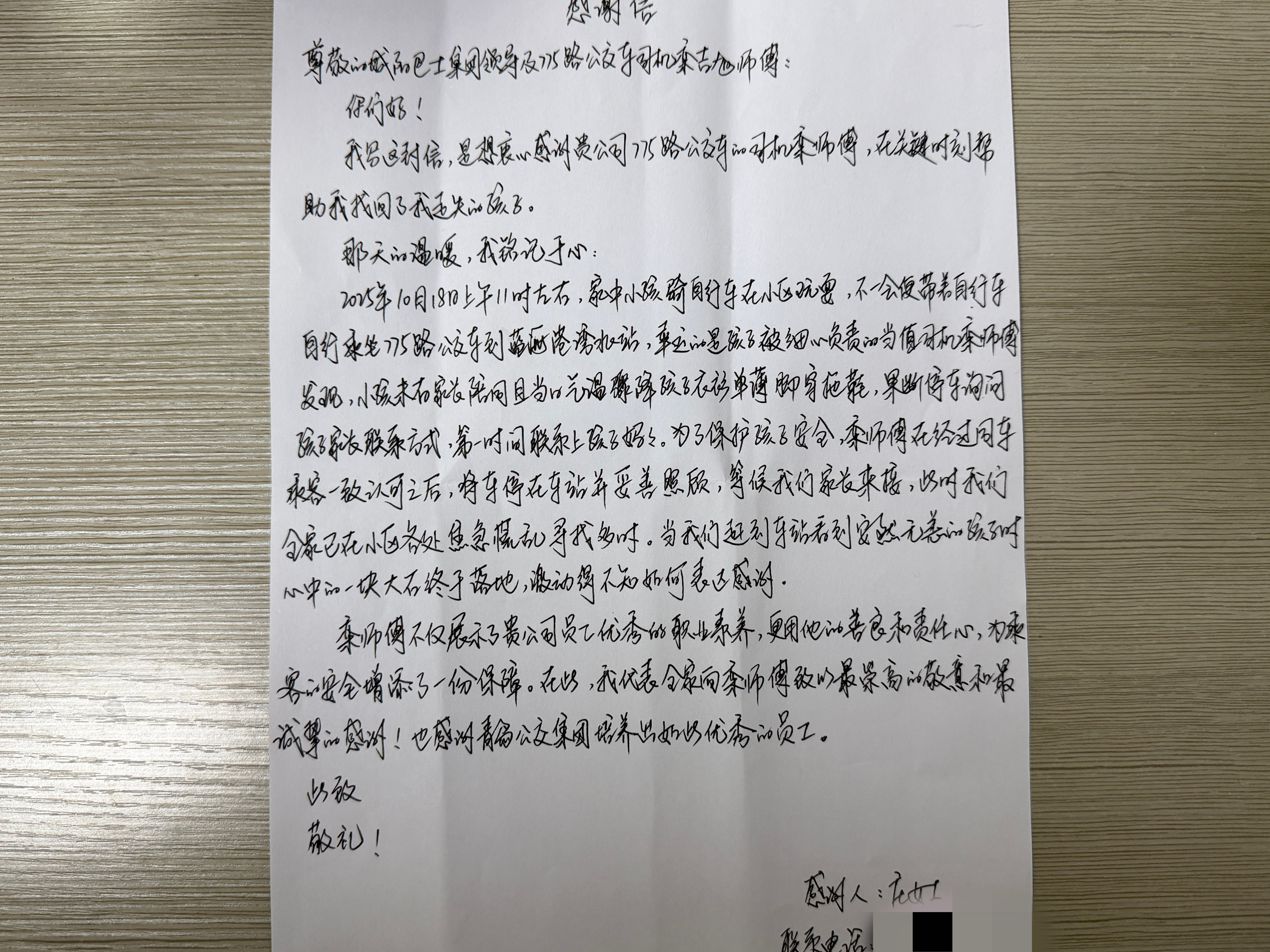 本以为这份温暖会就此定格,没想到几天后,这位家长再次来到天山一路场站,手中不仅多了一面锦旗,还有一封字迹工整、饱含深情的感谢信,字里行间满是对栾师傅的认可与感动。