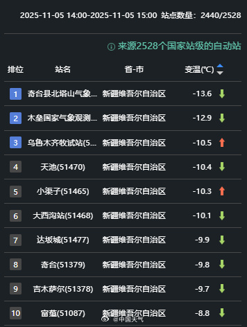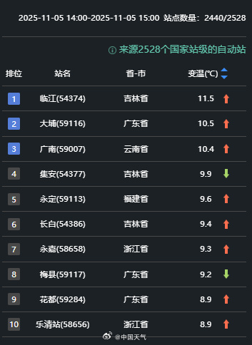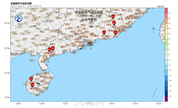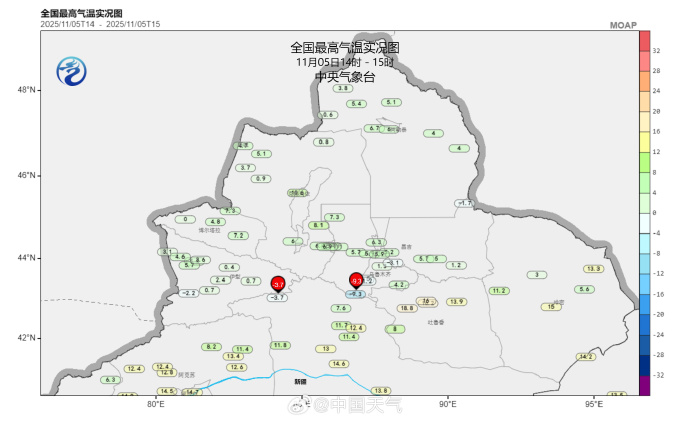 今天下午,东北东部、江南南部、华南多地降水结束,部分地区还见到了太阳,气温明显回升,华南多地气温逼近30℃。而在冷空气和雨雪影响下的新疆北部,出现6-12℃的明显降温。14-15时 ,新疆的吐尔尕特与海南乐东气温差了41.1℃。