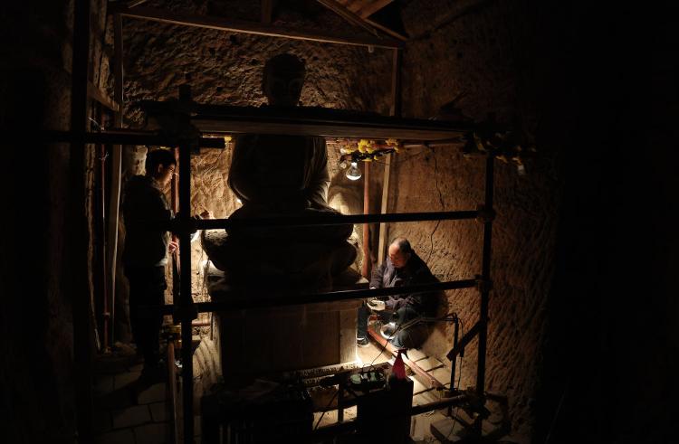2024年11月2日,麦积山石窟艺术研究所保护研究室的高级文物修复师牟常有(右)和徒弟何举在麦积山石窟133窟内修复塑像。自1985年至今,牟常有在麦积山石窟艺术研究所工作已有四十年。经过多年磨砺,牟常有的文物修复技艺日臻成熟,面对年轻人的请教,他更是倾囊相授。“塑像壁画皆是凝固的历史,守护它们,需要耐心和毅力,相信年轻人能够接好接力棒,让这份珍贵的人类文化遗产永续。”牟常有说。
