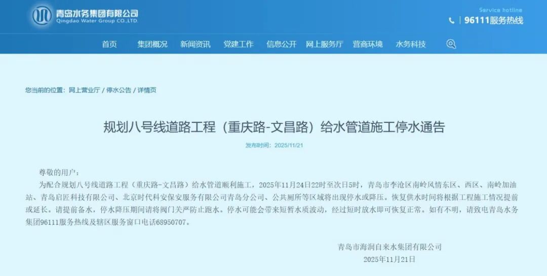 为配合规划八号线道路工程(重庆路-文昌路)给水管道顺利施工,2025年11月24日22时至次日5时,青岛市李沧区南岭风情东区、西区、南岭加油站、青岛启匠科技有限公司、北京时代科安保安服务有限公司青岛分公司、公共厕所等区域将出现停水或降压。恢复供水时间将根据工程施工情况提前或延长。请提前备水,停水降压期间请将阀门关严防止跑水。停水可能会带来短暂水质波动,经过短时放水即可恢复正常。如有不明,请致电青岛水务集团96111服务热线及辖区服务窗口电话68950707。