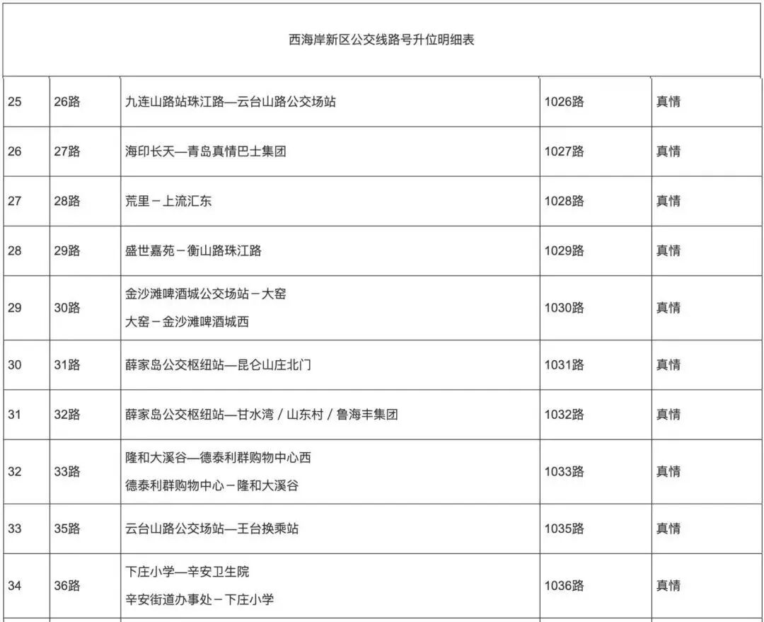 西海岸新区公交线路号升为四位,格式为1XXX,首位数字1代表在新区区域内运行的线路,与青岛市区及其它区市线路号进行区分。
