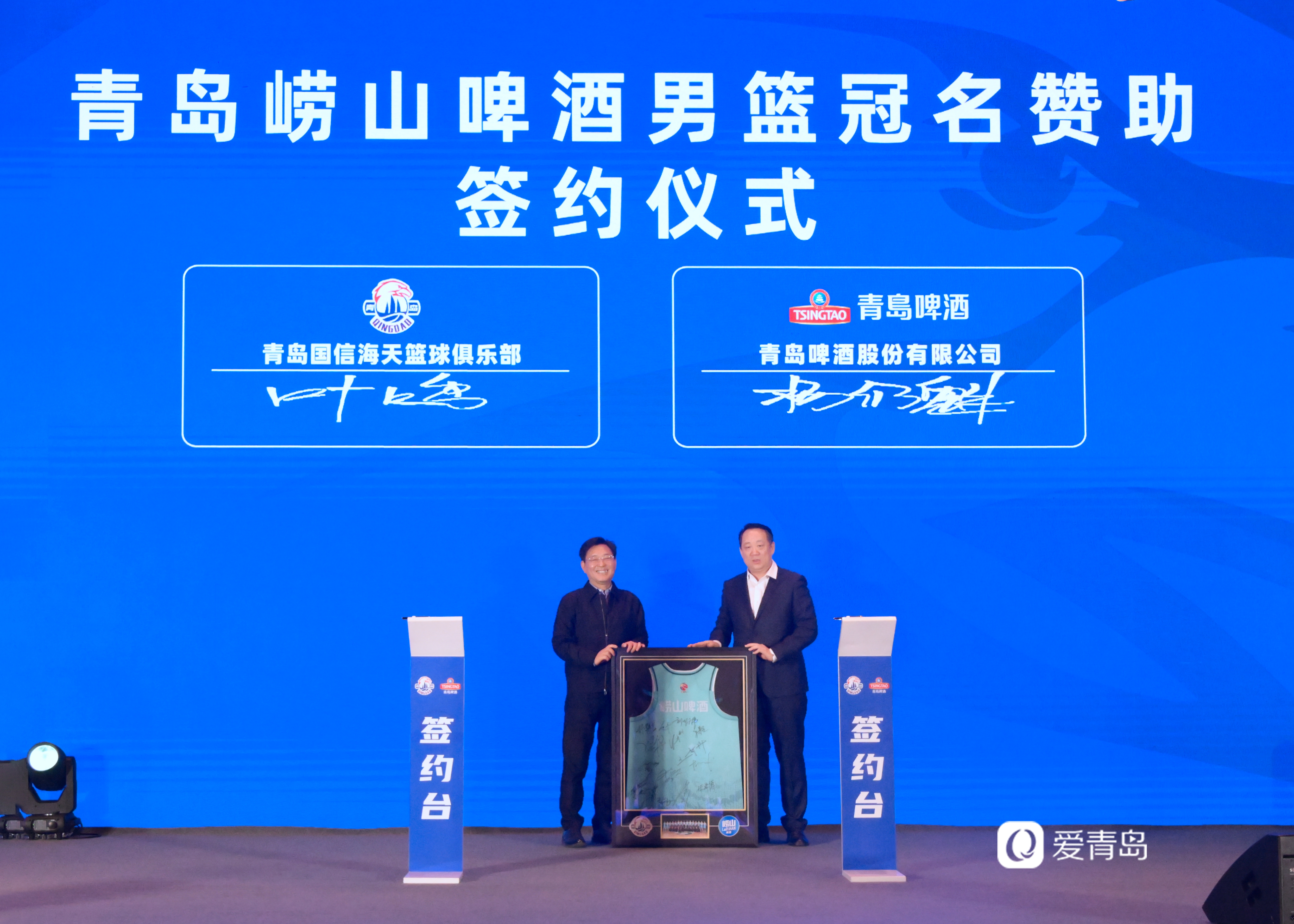 仪式上,青岛国信海天篮球俱乐部与青岛啤酒旗下品牌——崂山啤酒的冠名合作正式官宣,合作双方现场完成签约,青岛国信发展(集团)有限责任公司党委副书记邓友成向青岛啤酒股份有限公司营销总裁蔡志伟赠送球队签名球衣。本赛季,球队将以“青岛崂山啤酒男篮”的全新身份亮相CBA联赛,这不仅是商业上的强强联合,更是两个深植于青岛民心的品牌,在打造“篮球之城”“啤酒之都”城市名片的双向奔赴和在体育文化层面的共鸣与融合。