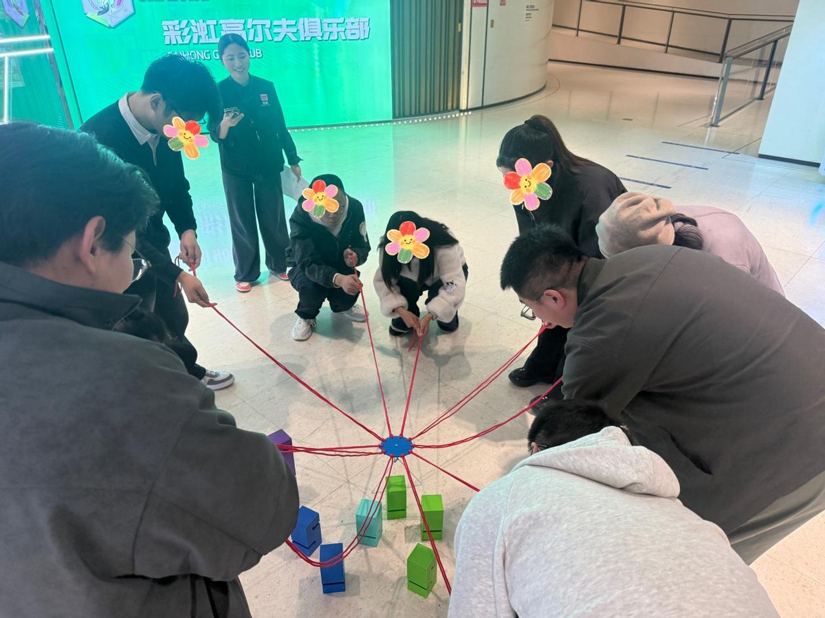 随后的团队小游戏环节将活动氛围推向高潮,“一圈到底”“珠行万里”“合力筑塔”“不倒森林”四大趣味关卡依次展开。“一圈到底”中,嘉宾们手拉手紧密配合,用灵活的动作传递呼啦圈,每一次成功衔接都伴随着阵阵欢呼;“珠行万里”考验团队的速度与衔接,乒乓球在众人手中的球槽间平稳传递,展现出高效协作的魅力;“合力筑塔”要求队员们精准把控力度,携手操控绳索搭建高塔,在专注与配合中凝聚信任;“不倒森林”则挑战节奏与平衡,大家默契移动、稳护PVC管,每一次坚守都彰显着团队的凝聚力。各小组全力以赴、默契配合,在竞技中加深了解,让友谊在协作中快速升温。