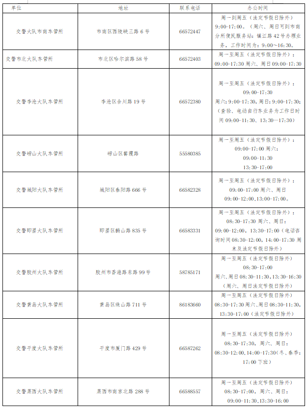 自2025年12月29日(周一)起,除危险货物运输车辆、警用车辆、校车、中型以上客车、使(领)馆车辆登记等业务外,原青岛市公安局车辆管理所(城阳区惠安路6号)车驾管业务大厅不再办理业务,原青岛市公安局车辆管理所业务二科(四流南路6号)车驾管业务窗口予以撤销。车辆查验类业务下放至各区(市)车管分所办理,具体地址可登录青岛市公安局官网(http://police.qingdao.gov.cn),在“执法办事服务窗口单位”栏目中查询。业务窗口办理时间为周一至周五9:00-17:00,周六、周日及法定节假日休息。相关业务问题可拨打0532-12123和0532-66200479进行咨询,业务窗口迁移期间,给您带来的不便,敬请谅解!