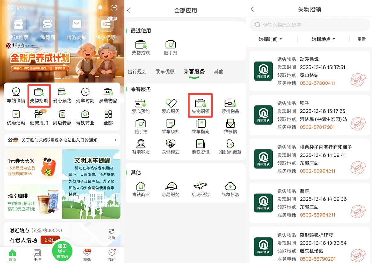 打开青岛地铁APP→首页找到【失物招领】(或点击“全部”找到失物招领板块)→浏览最新清单→发现相似物品→按服务电话联系车站。