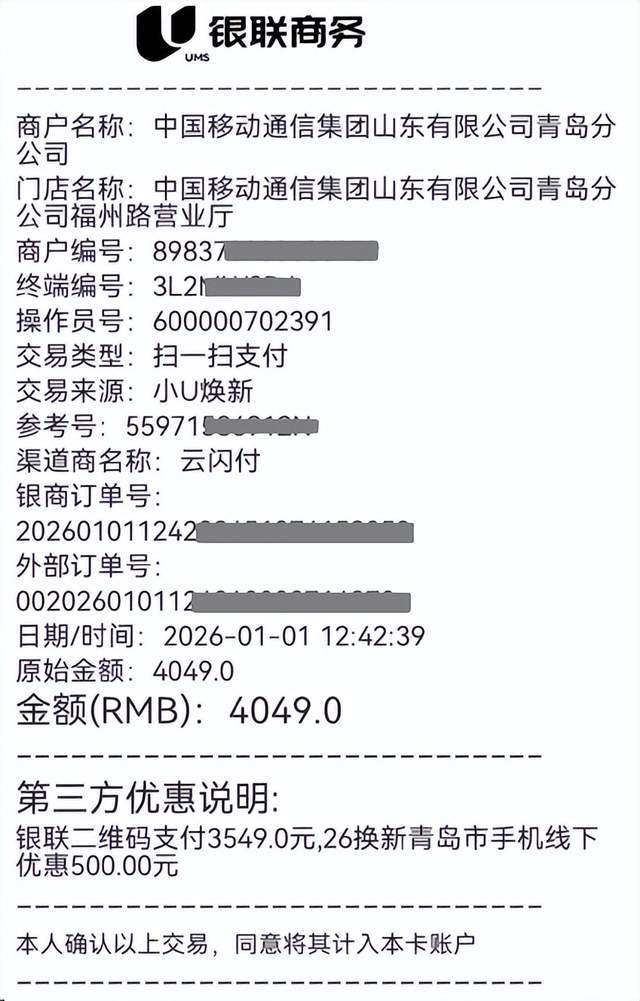 2026年1月1日,《2026年家电以旧换新、数码和智能产品购新补贴》政策正式生效,山东移动率先发力,在青岛福州路营业厅成功售出全省首单国补手机,用实打实的优惠点燃了市民元旦换机热潮。当天,不少消费者走进山东移动各大营业厅,趁着政策东风解锁新年新装备,现场人气火爆。