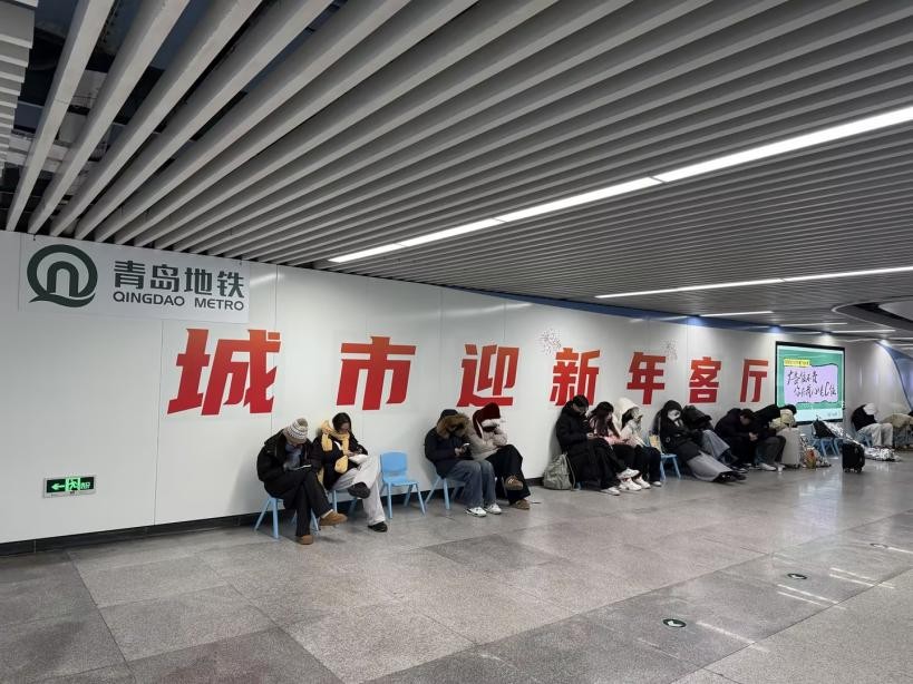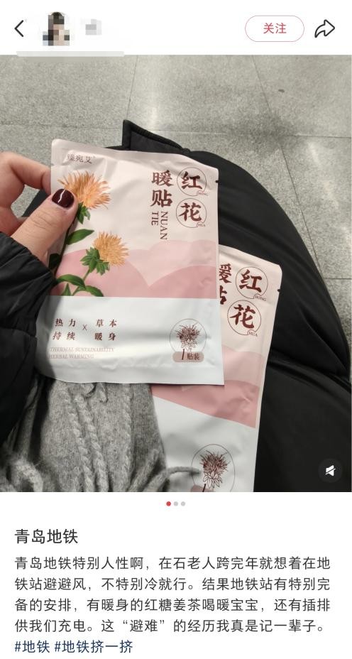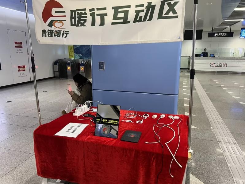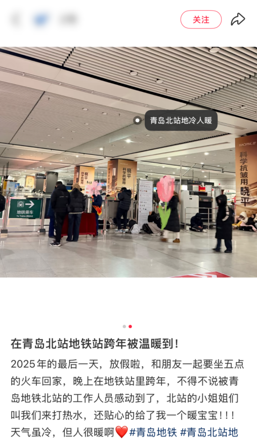 五四广场站也在“绿波新年暖心驿站”内摆放小蓝凳,让在站内停留的乘客得以进行短暂休憩。运营结束后,车站仍继续为近百名在车站过夜休息的乘客提供热水、方便面等暖心物资,并协调充电宝供乘客充电;地铁青岛北站也为乘客送上热水、暖宝宝等,让寒冷冬夜里的地铁站更添一份从容与温度,将关怀融入每一处细节。
