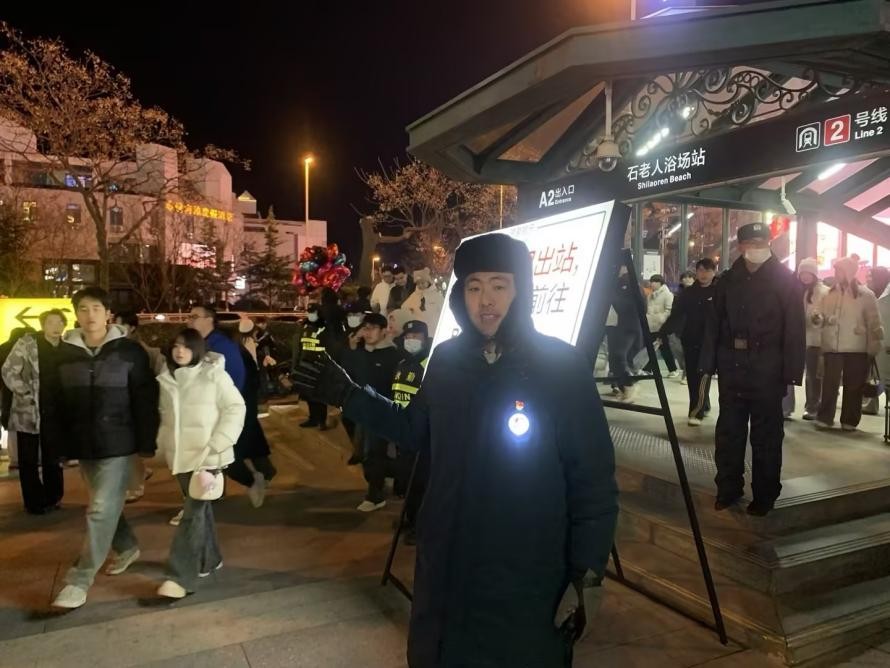 站台上,列车密集到站,人流不断涌入站台。“请先下后上!”同样的提示被重复上千遍。站台岗紧握着站台门钥匙,进行乘车引导,他们深知今夜客流的节奏,手中的喇叭、规范的手势、警惕的目光,在喧闹中构筑起有序的屏障。