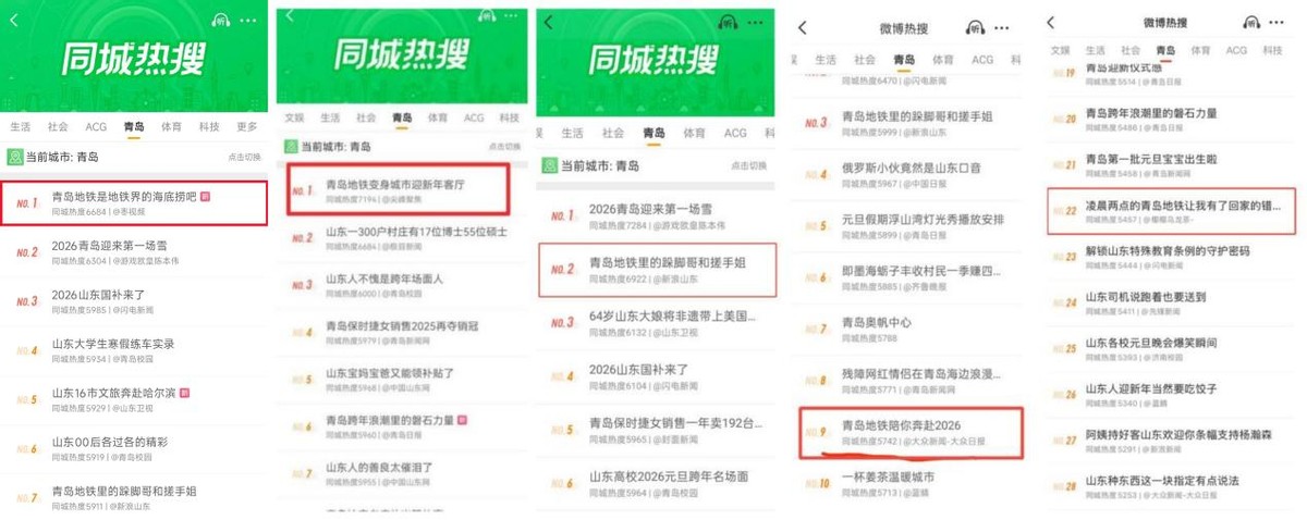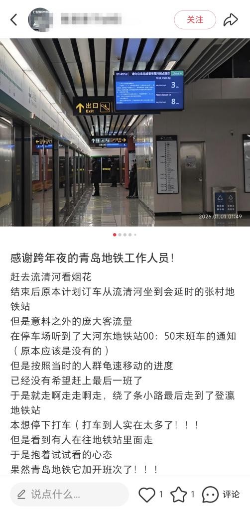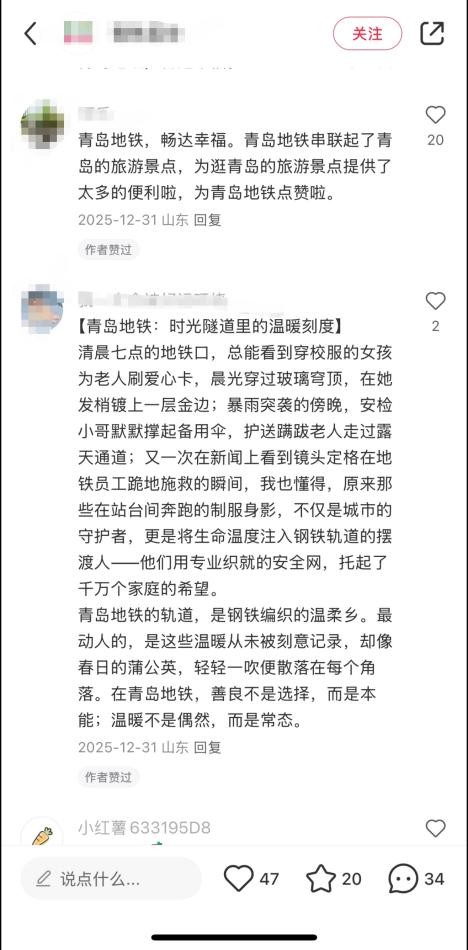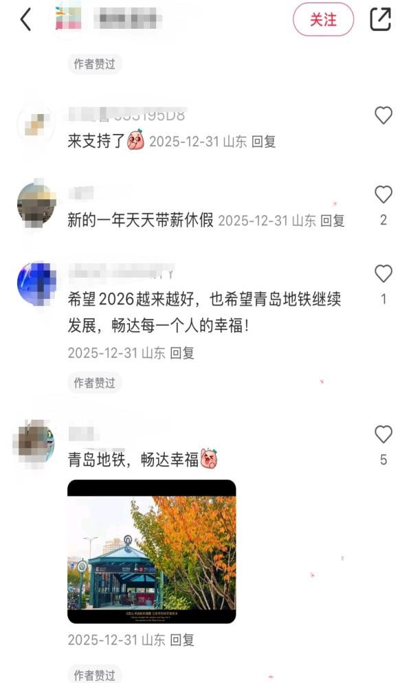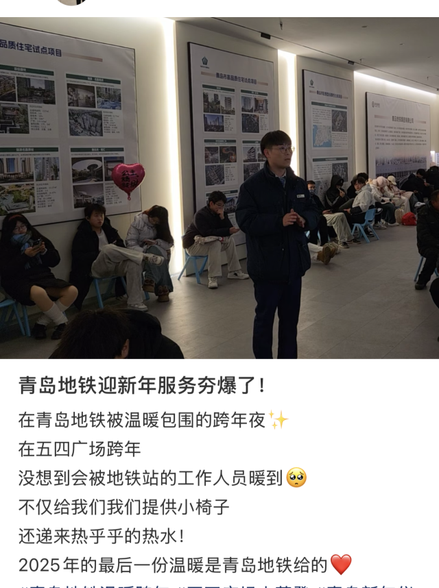 QMG青岛广电1月2日讯 当#青岛地铁变身城市迎新年客厅#、#青岛地铁里的跺脚哥和搓手姐#、#青岛地铁陪你奔赴2026#、#凌晨两点的青岛地铁让我有了回家的错觉#、#青岛地铁是地铁界的海底捞吧#5个话题在2026年元旦清晨陆续登上热搜,其中包含2个热搜第一,1个热搜第二,话题累计阅读量超600万,且热度持续攀升,获新京报、澎湃新闻、大众日报、青岛日报、青岛电视台等多家主流媒体报道。一段段来自乘客的真情分享被不断转发——“凌晨两点的地铁站里,姜茶是温的,椅子是暖的,纪念卡是贴心的,青岛地铁真的把‘情绪价值’拉满了!”“本来只是躲进来取暖,却在这里感受到了家的温暖。”