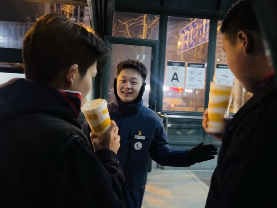 在石老人浴场站站厅内,布置了别样的城市迎新年客厅,座椅整齐排列,还增添了一次性盖毯和简易坐垫;热水持续供应,红糖姜茶被放在保温桶里;暖宝宝、暖足贴等御寒物品也向有需要的乘客递上;多口充电插排等待为乘客的手机充电续航;一张张“暖行日出纪念卡”被送到乘客手中,上面清晰地印着首班车时间与日出指引,成为一份实用且心意满满的新年问候。