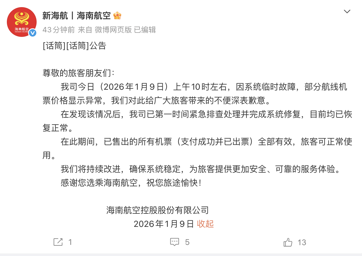 我司今日(2026年1月9日)上午10时左右,因系统临时故障,部分航线机票价格显示异常,我们对此给广大旅客带来的不便深表歉意。