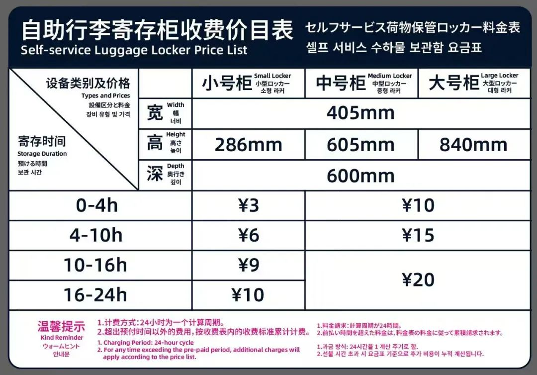 按行李大小和寄存时长收费: