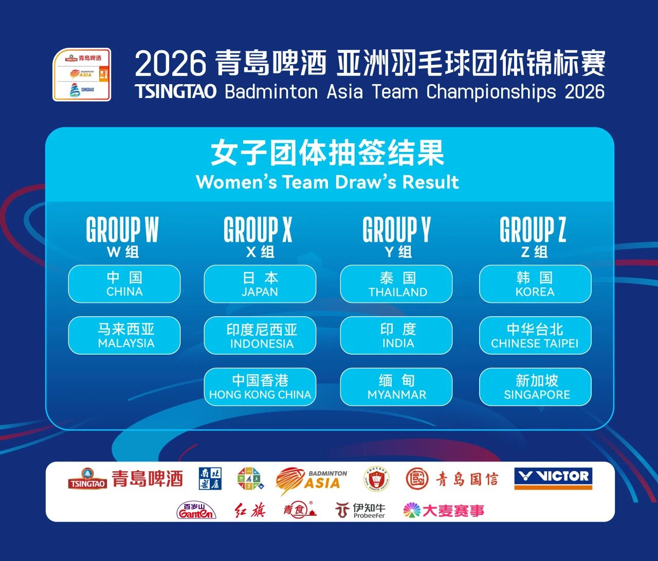 QMG青岛广电1月10日讯 1月9日,2026青岛啤酒亚洲羽毛球团体锦标赛(以下简称“亚团赛”)进行了小组抽签仪式。本届赛事分为男子团体与女子团体两个项目,男团方面,中国队作为卫冕冠军与泰国队、中国澳门队位列A组;女团方面,中国女团作为头号种子与马来西亚队一起被分入W组。