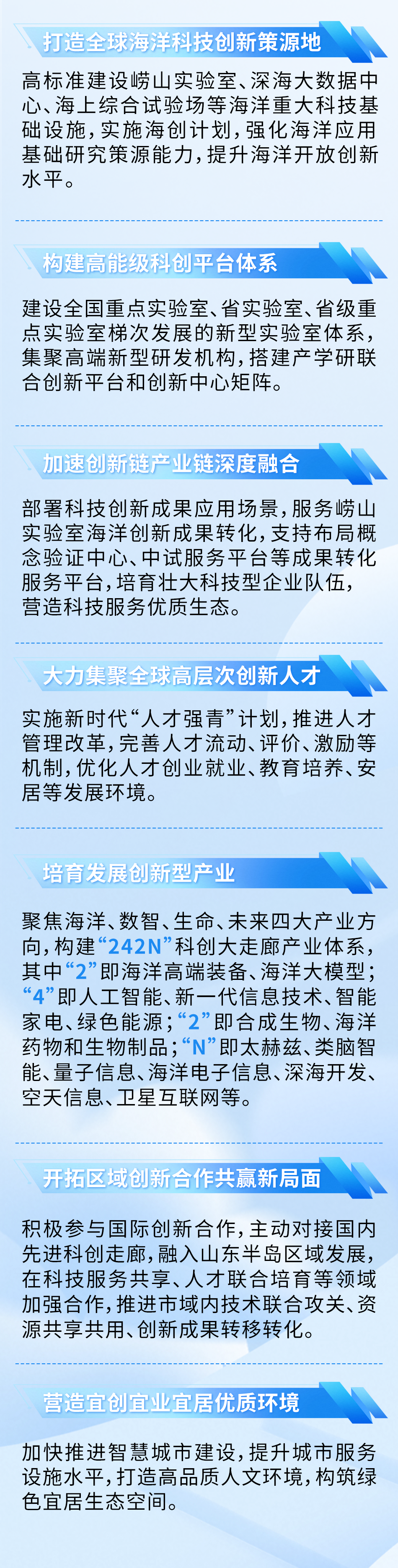 以数智产业城、青年科创城、海洋科技城为支点推动全域一体化发展格局。其中,数智产业城位于崂山区,聚焦科技创新和产业创新深度融合,打造新兴产业和未来产业引领地。青年科创城位于李沧区,聚焦营造“科产城人”优质生态,打造宜创宜业宜居的城市创新空间;海洋科技城位于青岛蓝谷,聚焦塑强海洋特色优势,打造具有全球影响力和竞争力的海洋科技创新策源地和海洋产业发展高地。
