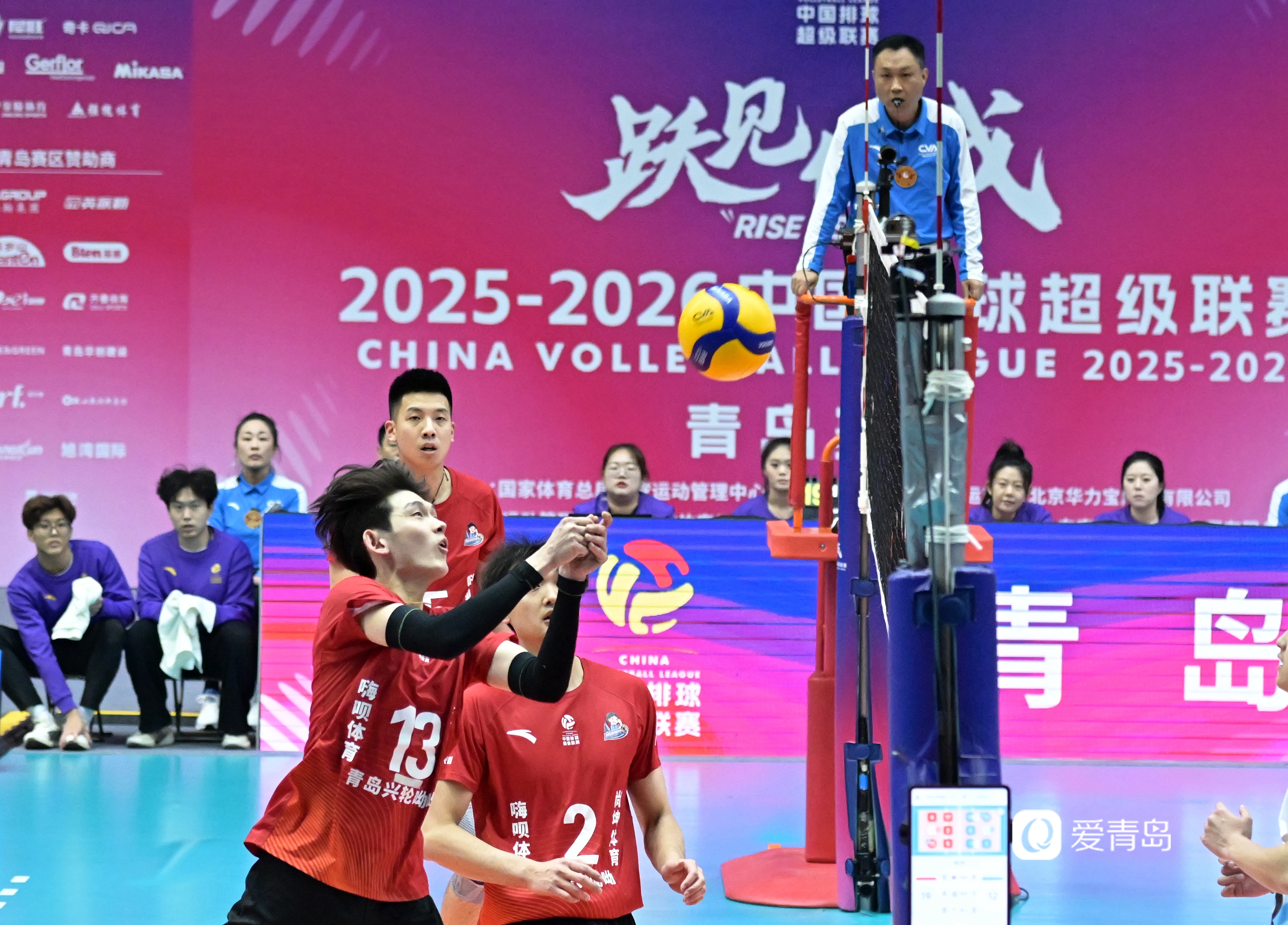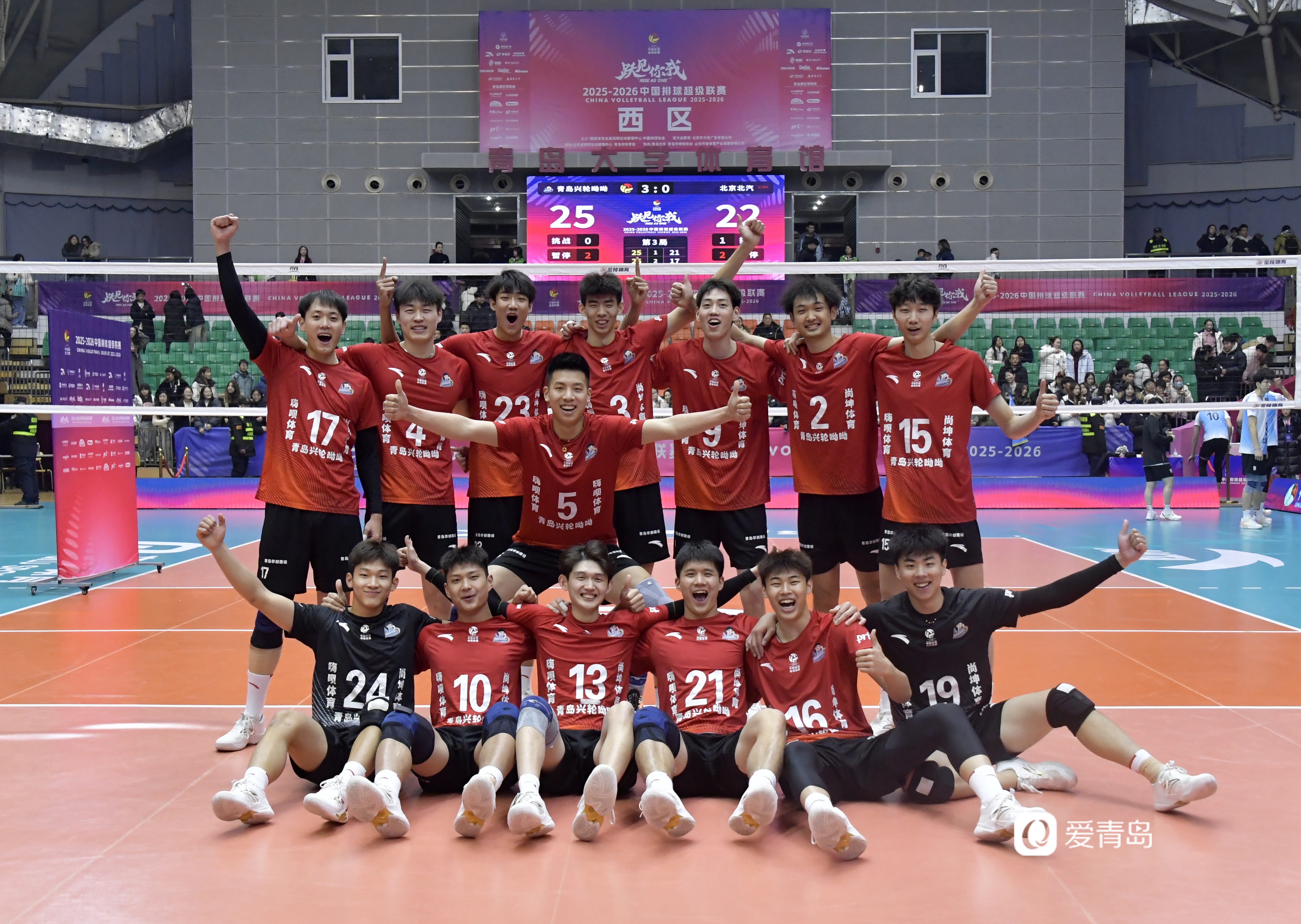 1月15日晚,2025-2026中国男子排球超级联赛常规赛A级第九轮焦点战在青岛主场打响,山东青岛兴轮呦呦男排 凭借火力全开的进攻与密不透风的拦防,以3-0(25:21、25:17、25:22)的比分干净利落地横扫北京北汽男排。