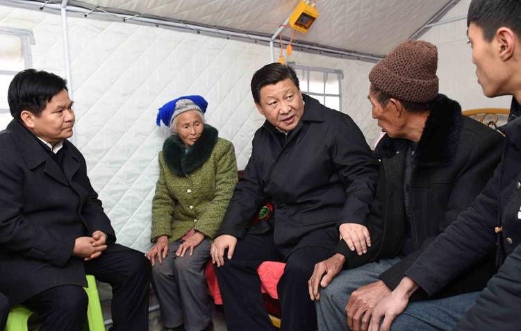 2015年1月19日,习近平总书记来到云南鲁甸县小寨镇甘家寨红旗社区过渡安置点,看望受灾群众甘正芬和她的老伴儿邹体富。