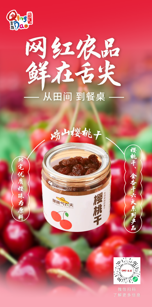 崂山樱桃干选用崂山北宅优质樱珠为原料,采用独特的慢煮慢烘工艺,配料表干干净净只有大樱桃。企业致力于用匠心做“单纯”好果干,以崂山优质鲜果为基础,配以传统浅加工工艺,产品包括樱桃干、金杏干等6大系列,已通过线上平台销售到全国各大主要城市。