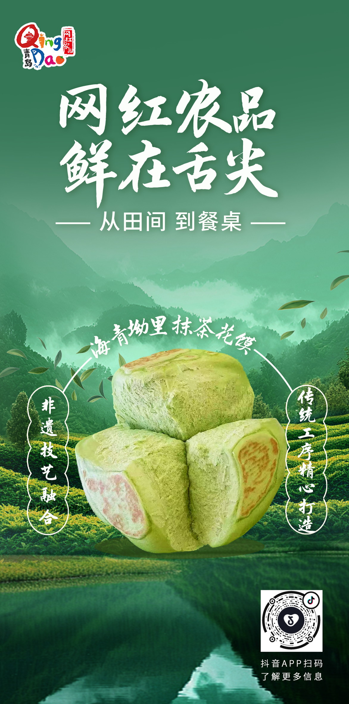 抹茶花馍由共富海青茶食工坊以非遗技艺融合海青茶创新推出,采用海青镇特有的抹茶粉和精选的面粉、牛奶、蜂蜜制作而成,通过揉、擀、捏、蒸等纯手工传统工序,精心打造出形态各异的抹茶花馍,产品中融入海青抹茶的清新,使得每一口都散发着自然的茶香。2023年,入选“山东手造·优选100”名录,2024年,中国日报社组织俄罗斯、巴基斯坦等海外自媒体打卡体验抹茶花馍制作,获《人民日报》《中国日报》聚焦报道。