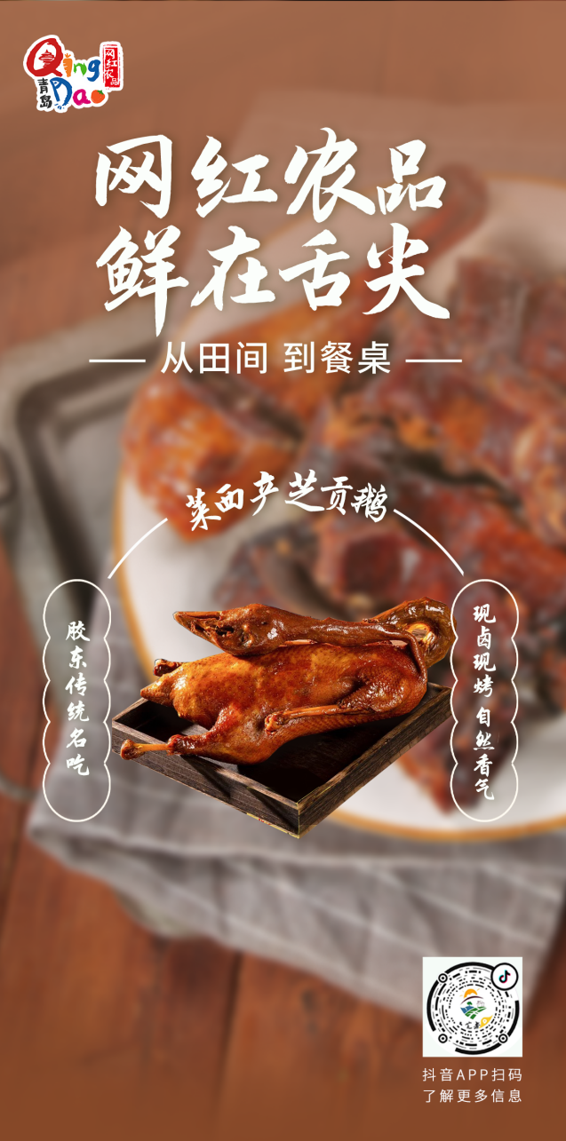 产芝贡鹅养殖基地100多亩,年养殖量3万余只,采用沽水养殖的生长6个月以上的鲜嫩活鹅,配上多种中药食材,现卤现烤,确保了鹅肉的鲜度,成色和自然香气。2025年获评青岛非遗美食百佳奖。