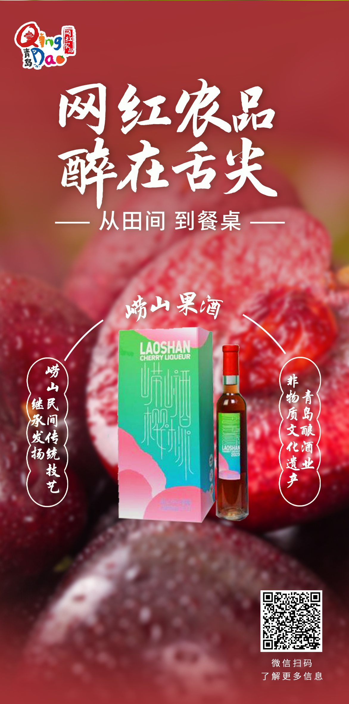 崂山果酒以北宅樱桃等当地优质水果为原料,用崂山泉水浸润,包括崂山樱桃酒、崂山杏酒及崂山樱桃酒珍藏版,是青岛大崂樱桃谷文旅管理有限公司2023年开始生产的果酒系列,其中樱桃酒酿造主要经过打浆、糖化、发酵、封缸、压榨、陈储、调整等工艺流程,酿造技艺已纳入崂山区级非物质文化遗产。